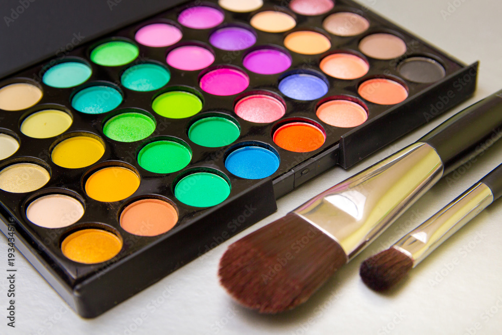 Brushes with an eyeshadow palette and lipstick in серебристом background. Decorative cosmetics for professional makeup. Eyeshadow colors trend.