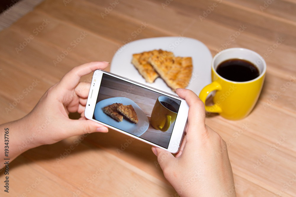 Using a mobile phone to photograph hot coffee and cookies on a wooden background with copy space. Photos of drinks and food for advertising or social media. Template.