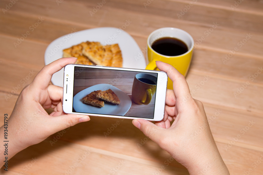 Using a mobile phone to photograph hot coffee and cookies on a wooden background with copy space. Photos of drinks and food for advertising or social media. Template.