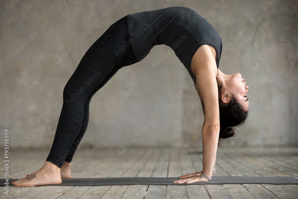 Young woman practicing yoga, doing Bridge exercise, Urdhva Dhanurasana pose, working out, wearing sportswear, black pants and top, indoor full length, gray wall in yoga studio