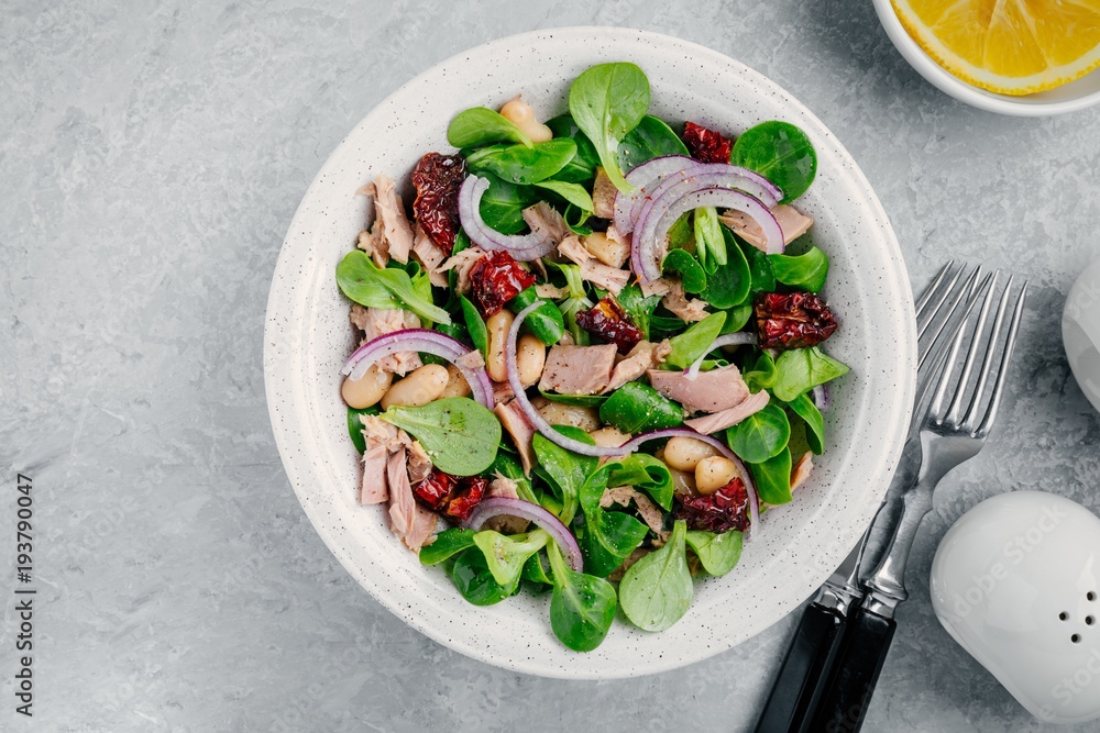 salad with white beans, tuna, red onions and dried tomatoes with green lettuce leaves