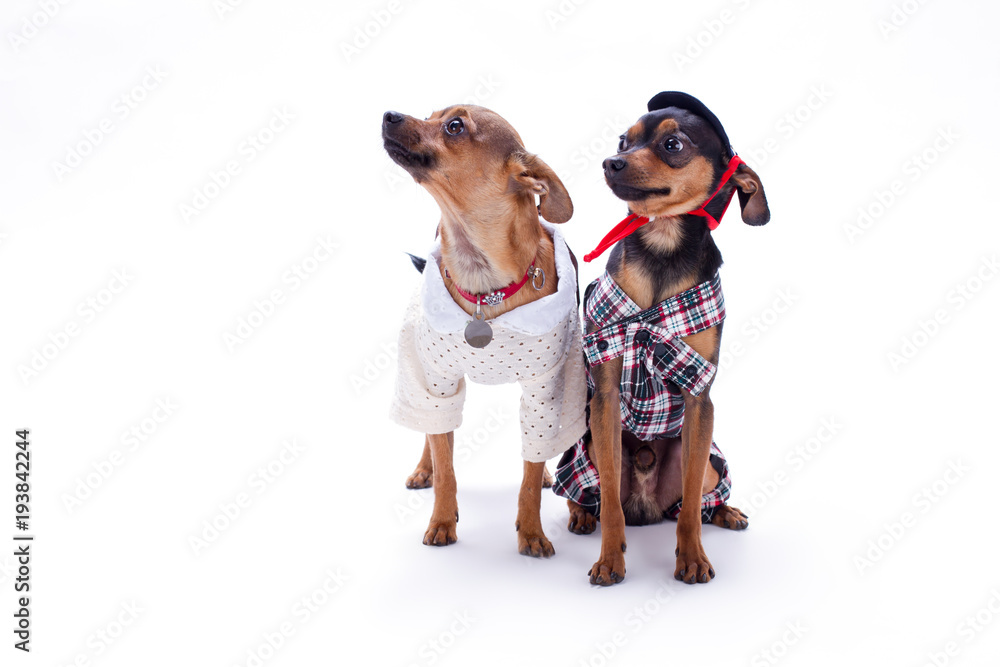 Russian toy terrier and chihuahua. Toy terrier and chihuahua in fashion apparel sitting isolated on white background, studio shot. Cute domestic companion.