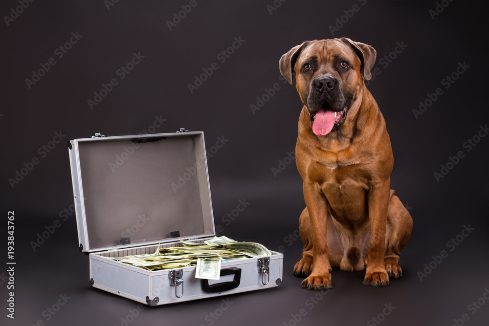 Cane corso and hundred of dollars. Huge pedigreed dog and suitcase full of currency on dark background, studio shot. Muscular protection of your finance.