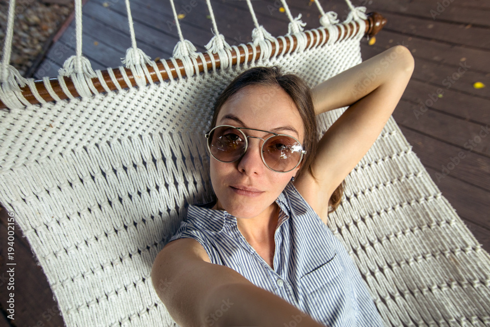 Vacation selfie. Enjoying the summer. Young pretty woman in hat laying in hammock on the beach.