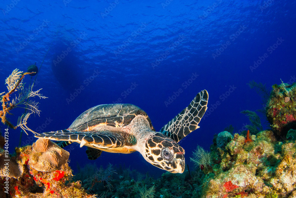 on the surface of the deep blue sea is the silhouette of a scuba dive boat. Right at the bottom of the mooring line is a hawksbill turtle, a common sight on this tropical reef in the Cayman Islands