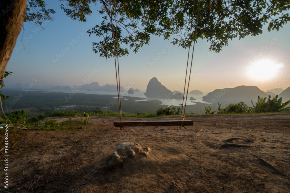 Empty swinging bench over beautiful tropical mountain landscape during sunrise