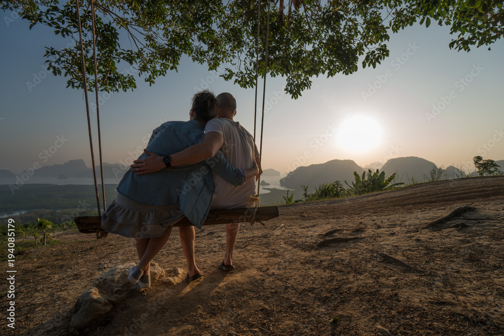 Couple sitting on the swinging bench over beautiful tropical mountain landscape during sunrise