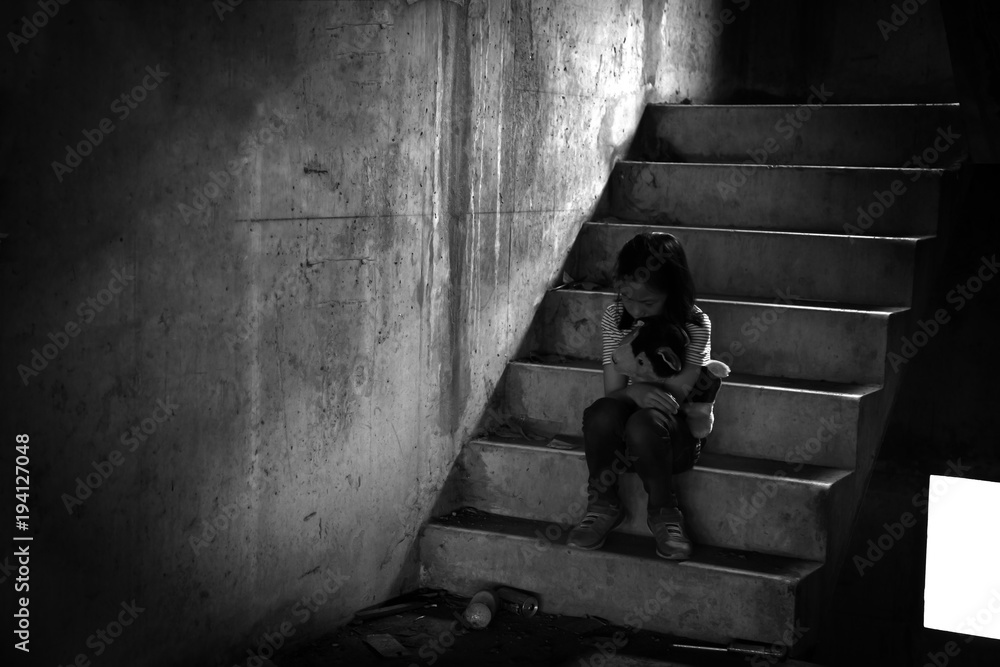 Depressed young girl sitting alone in an abandoned building