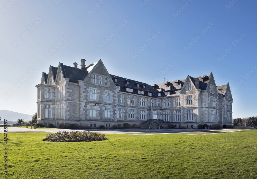 Beautiful shot of XIX Century eclectic style palace at natural environment surrounded by green grass terrain