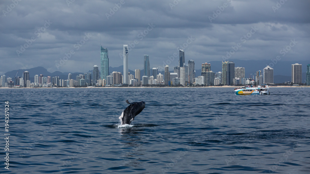 Minke whale calf jumps out of the water in front of the Gold Coast coastline