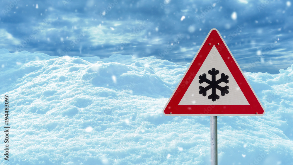 Rotes Verkehrsschild mit Schneeflocke in verschneiter Winterlandschaft