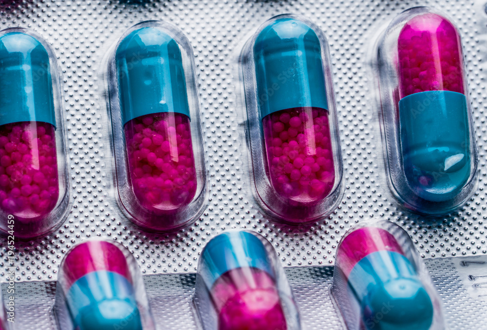 Macro shot detail of blue, pink capsule with granule in side pills. Pills in blister pack. Pharmaceutical dosage form and packaging. Itraconazole 100 mg : Anti-fungal medicine.