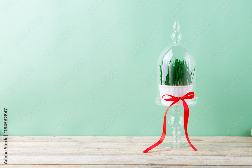 Easter green wheat grass in small various sizes, Novruz spring celebration nature awakening symbol, fresh green grains sprouting in white bowls on wooden table, semeni Azerbaijan, Persian nowruz sabzi
