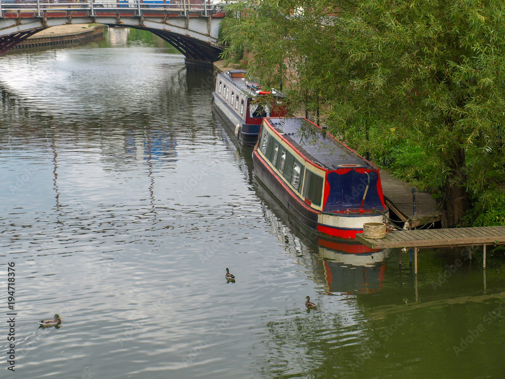 River view with mooring narrowboats and a bridge in Tewkesbury in Gloucestershire, Great Britain.