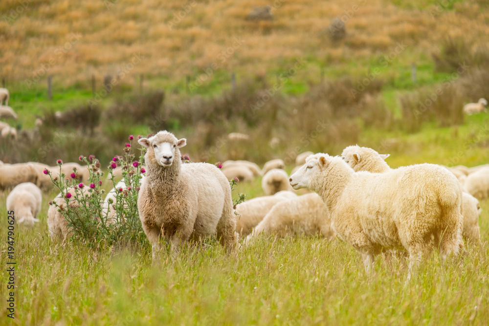 Flock of sheeps grazing in green farm in New Zealand with warm sunlight effect