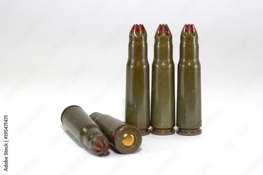 Five blank cartridges for Kalashnikov assault rifles on white background close-up, scattered
