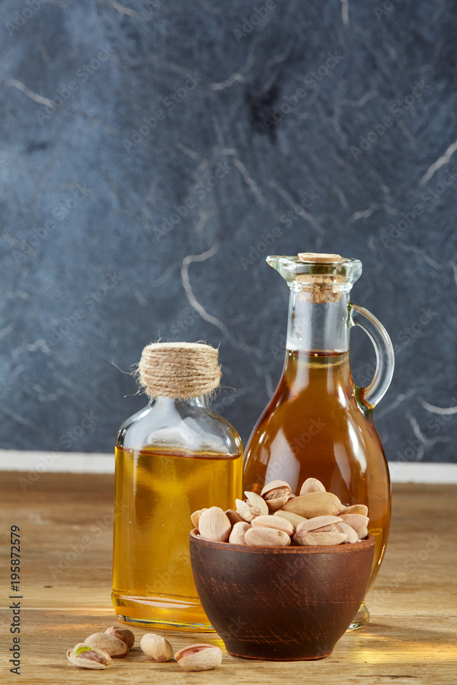 Aromatic oil in a glass jar and bottle with pistacios in bowl on wooden table, close-up.