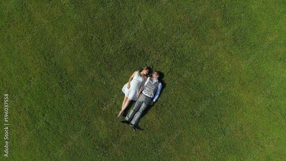 AERIAL TOP DOWN Happy parents to be relaxing side by side in field holding hands
