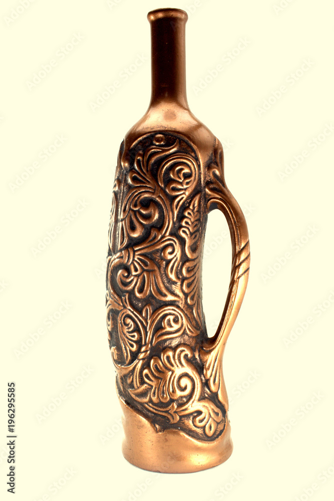 Ceramic bottle for wine with a handle on the right side on a white background close-up