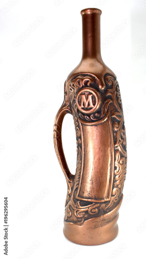Ceramic bottle for wine with a handle on the left side on a white background close-up