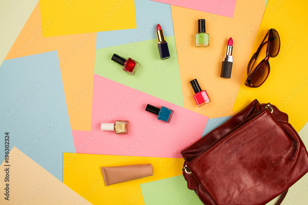 Things from open lady purse. Cosmetics and women's accessories fell out of red handbag on colourful background. Top view.