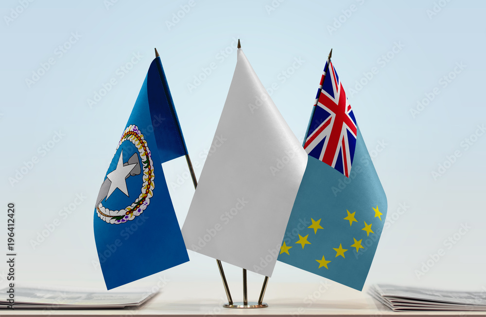 Flags of Northern Mariana Islands and Tuvalu with a white flag in the middle