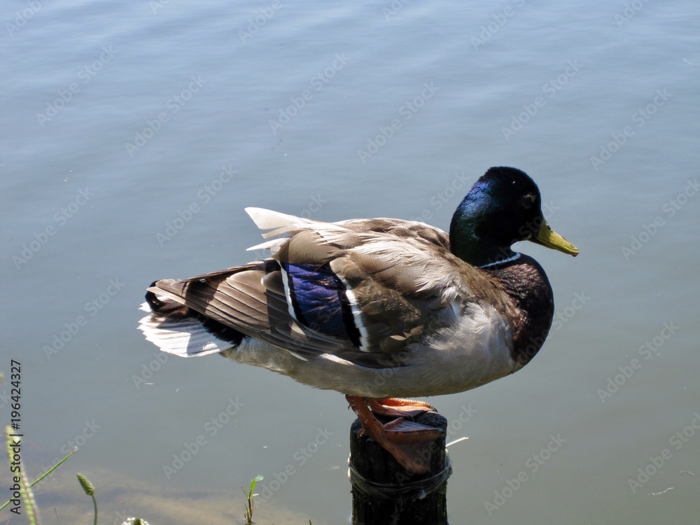 Pato real em cima de tronco