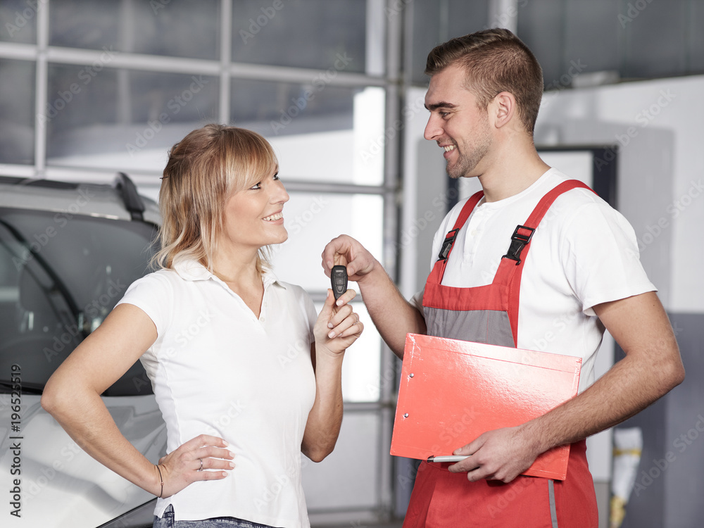 Mechaniker und Kundin in der Werkstatt