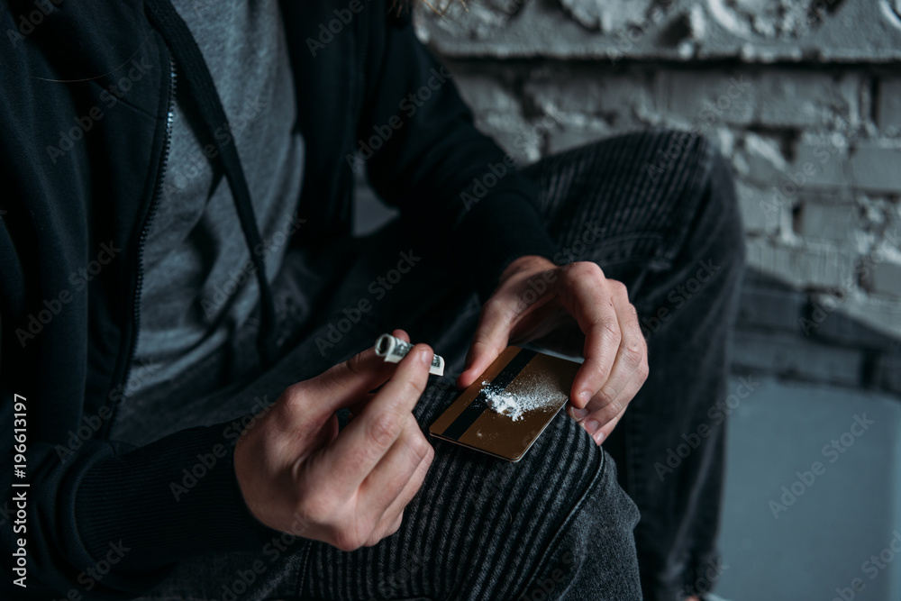 cropped shot of addicted junkie sniffing cocaine from credit card