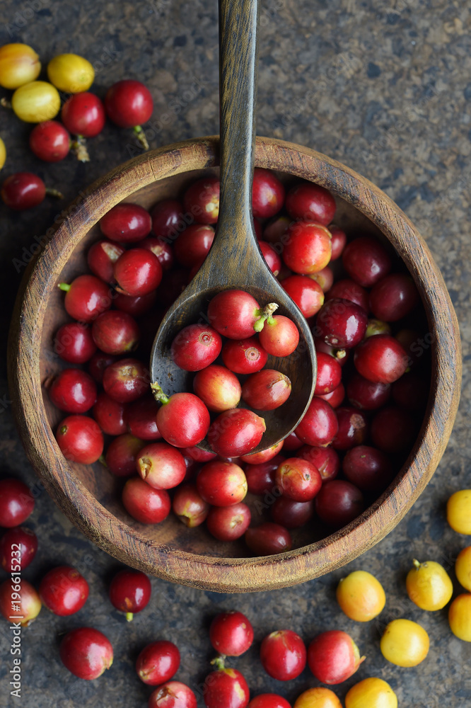 fresh coffee beans in wooden bowl