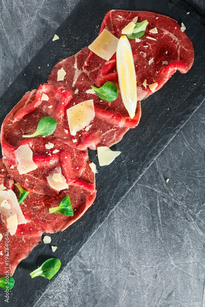 Top view of the raw beef carpaccio with parmesan cheese on a black shale service board. Delicatessen food. Copy space.