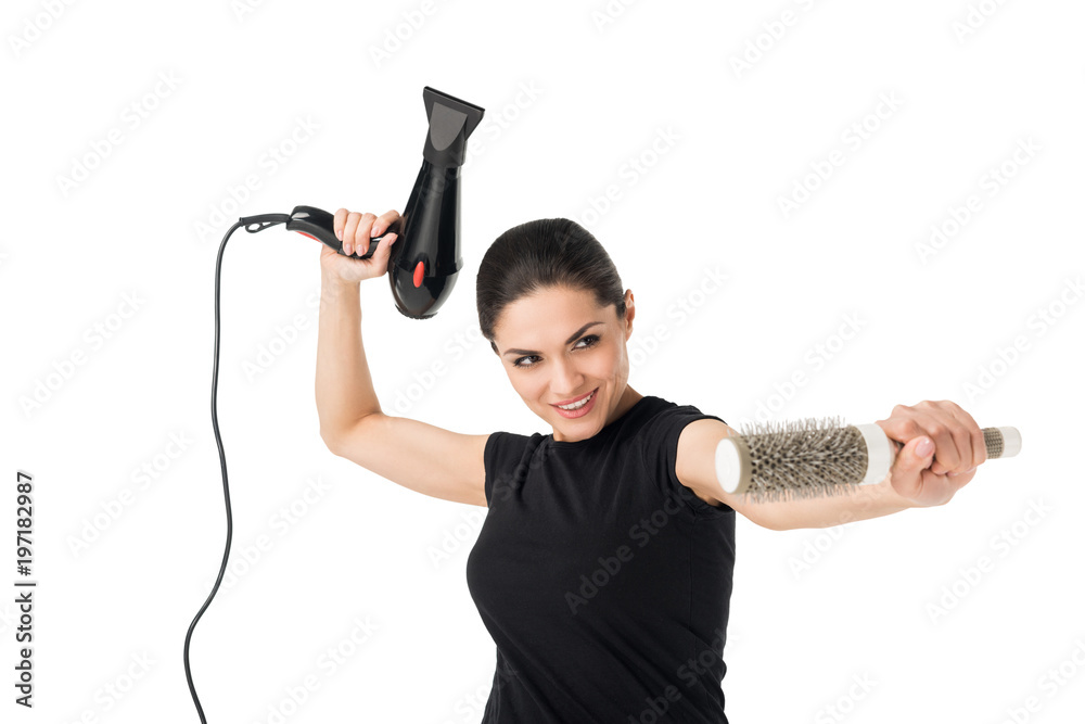Female hairdresser fooling with dryer and hairbrush isolated on white