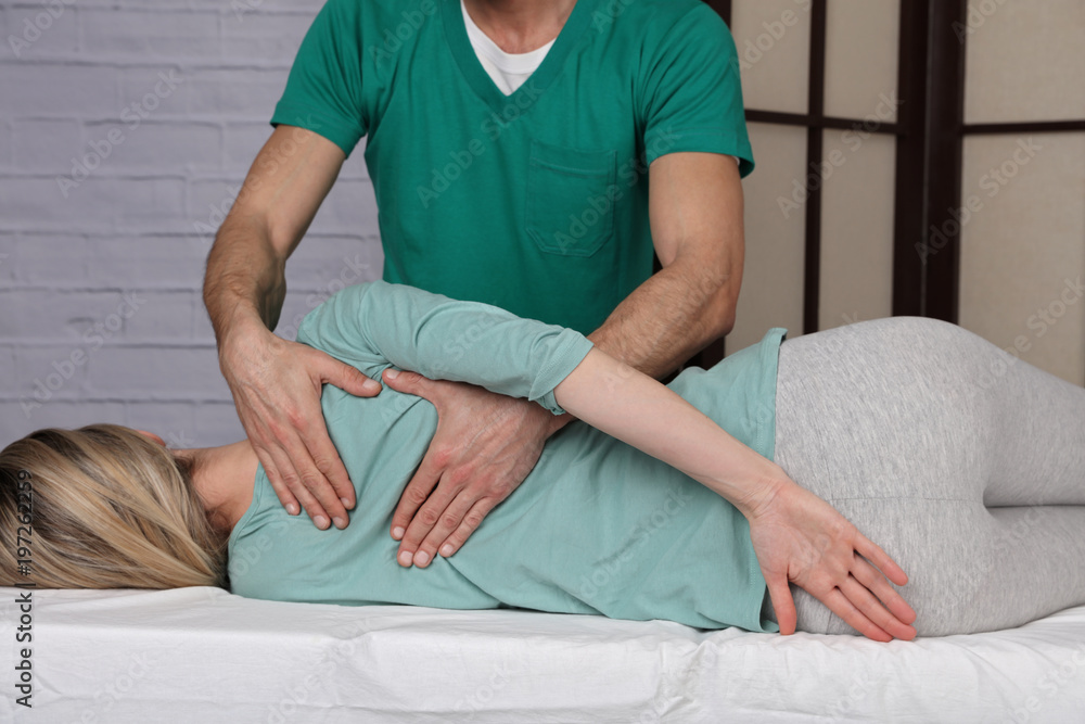 Woman having chiropractic back adjustment. Osteopathy, Physiotherapy, sport injury rehabilitation concept