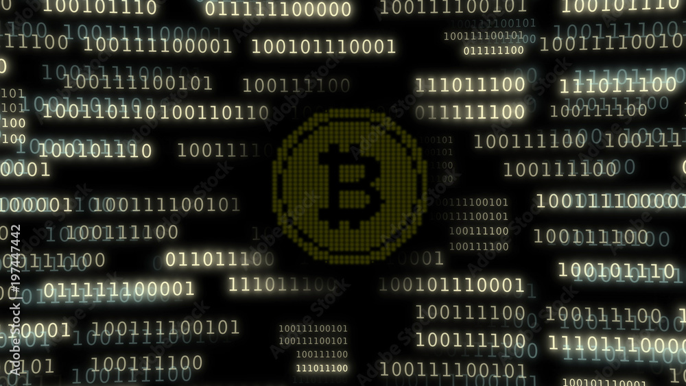 Start fall of bitcoin mining or fall, grow down of bitcoin. Non-glowing bitcoin in bright glowing binary code. Cyberspace as big data, surrounds a coin of Crypto-currency.