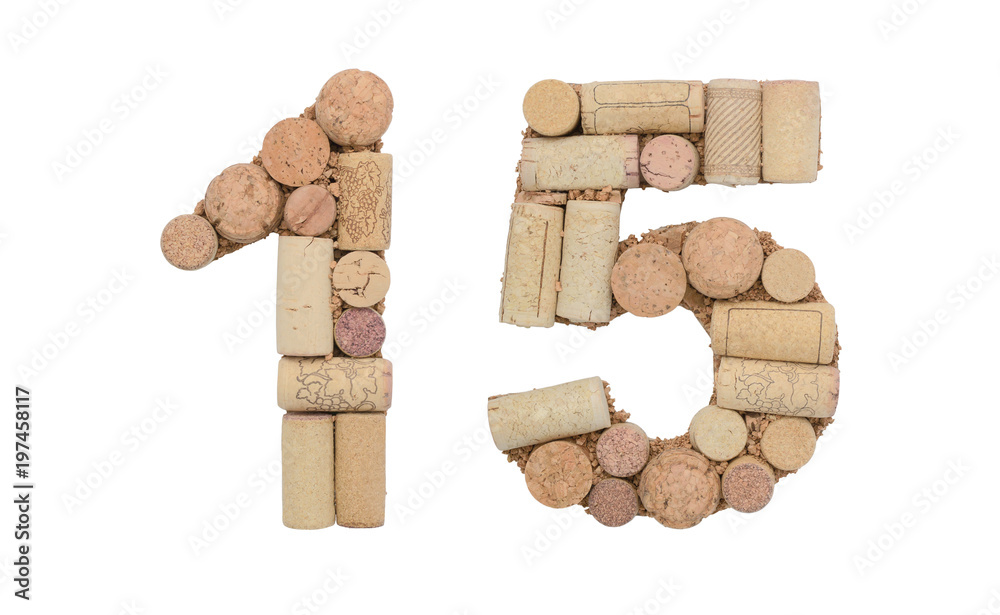 Number 15 fifteen made of wine corks Isolated on white background