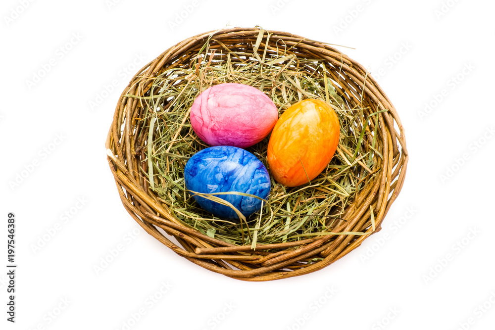 Osternest mit Ostereier eier osterei ei isoliert freigestellt auf weißen Hintergrund, Freisteller