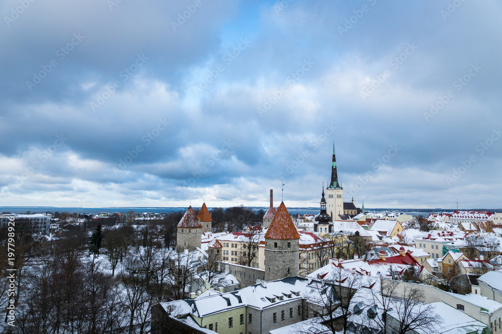 Tallinn old town with snow in winter, Estonia. The old town is a popular tourist spot in the city center of Tallinn.