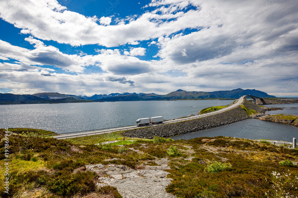 Truck rushes down the highway in the background Atlantic Ocean Road Norway.