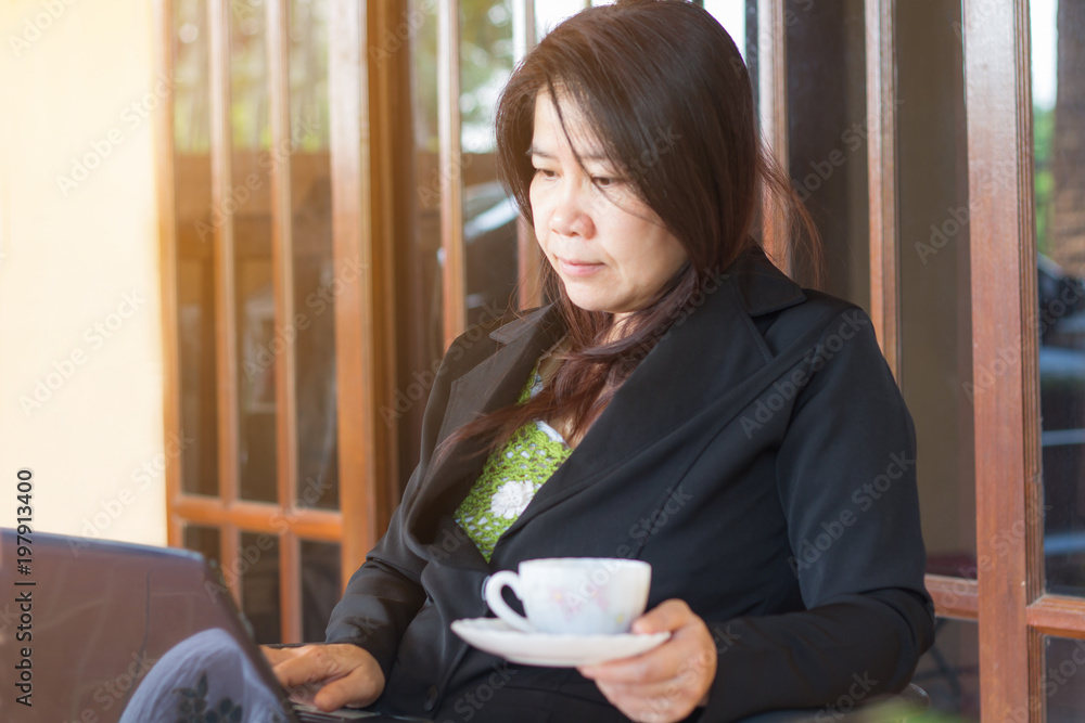 Beautiful asian woman in black suit sitting on chair working on notebook with coffee at home,selective focus