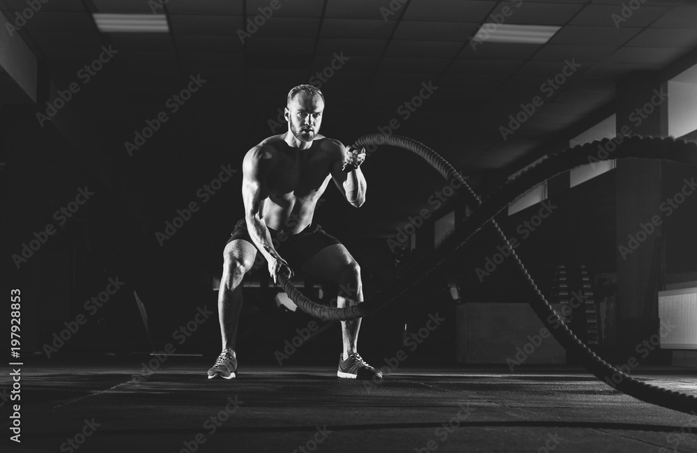 Athletic young man with battle rope doing exercise in the fitness gym. Sports concept.