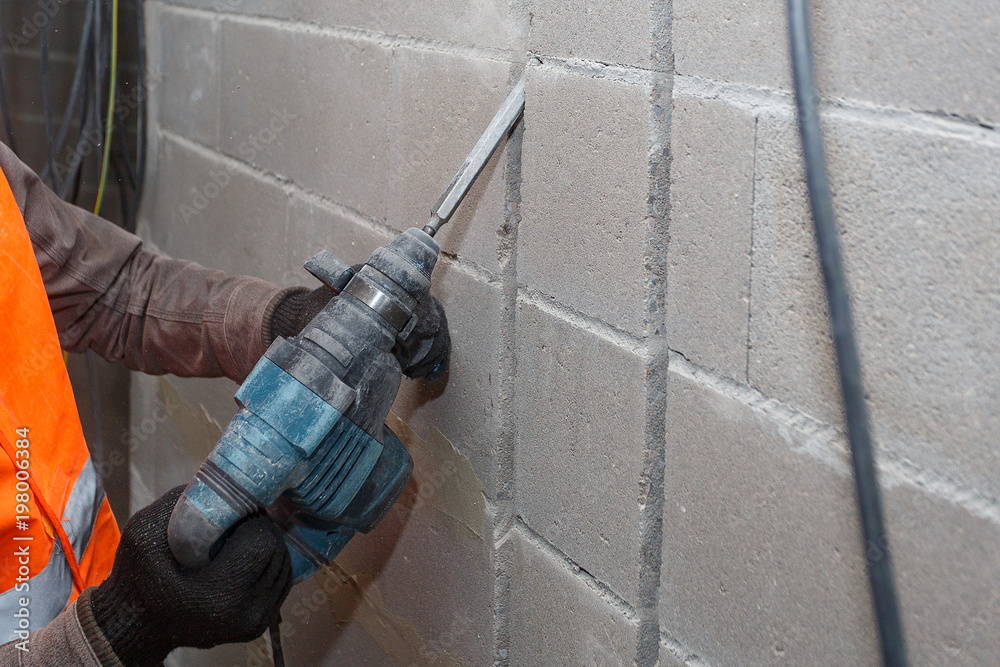 Hands of the worker in gloves cut through the concrete wall with a perforator, close-up.