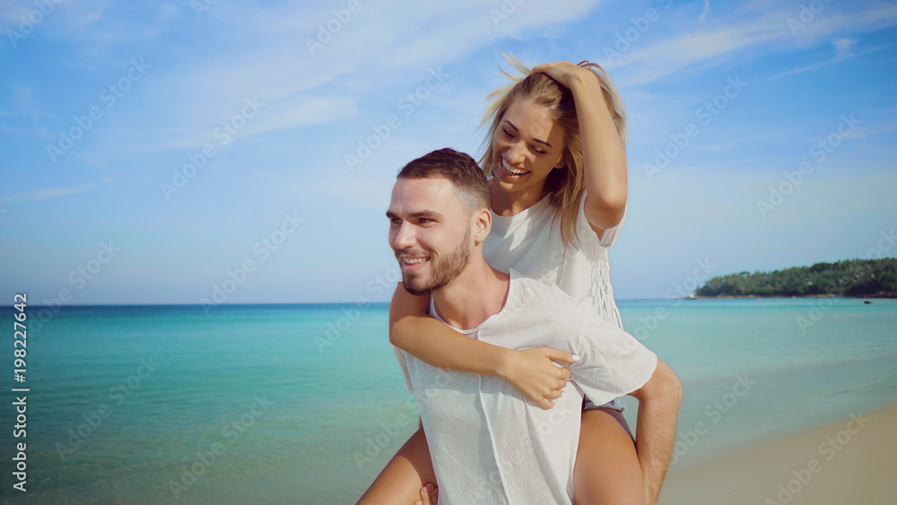 Beautiful happy couple having fun, doing piggyback on tropical sandy beach over sea and sky background