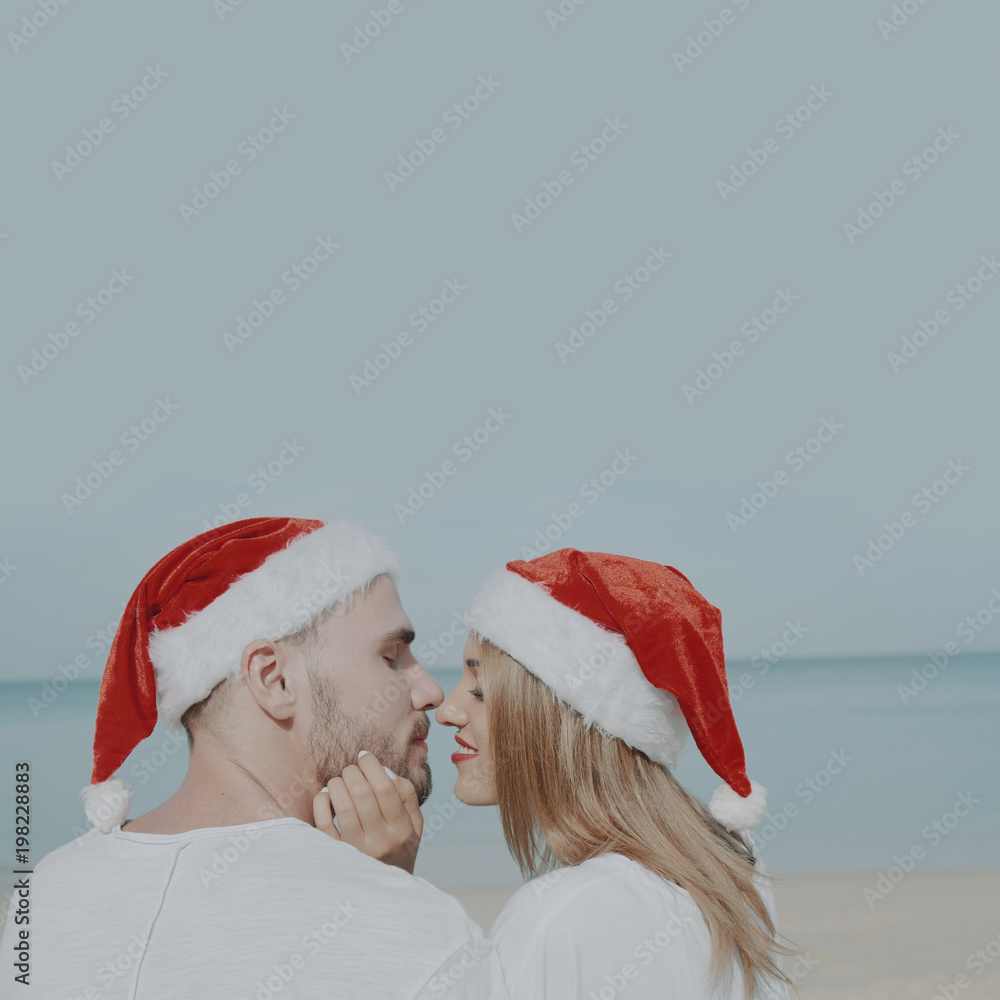 Christmas beautiful beach couple wearing Santa hat in summer sun in love on travel holidays on tropical travel destination during winter holidays
