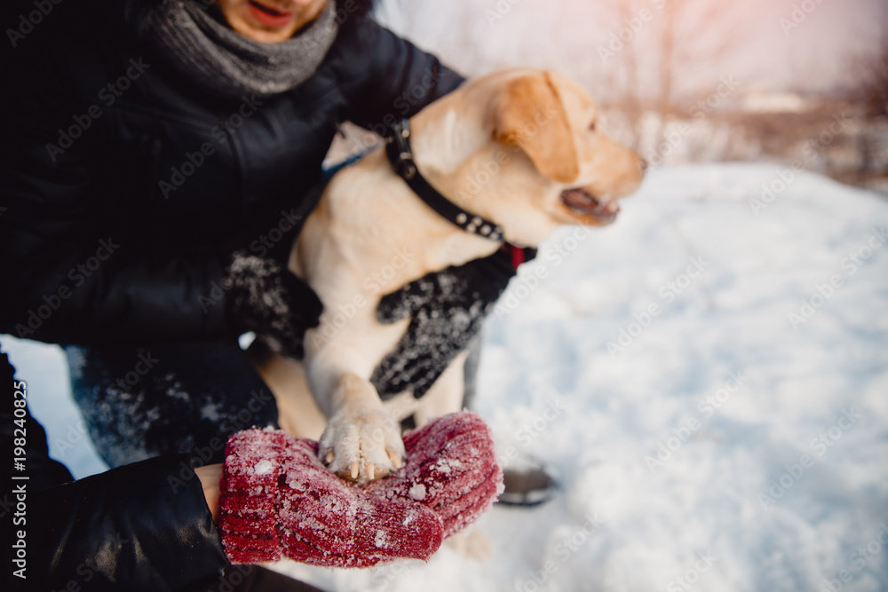 Friendship dog. Pair is holding labrador dog paw in winter. The dog looks into frame and smiles.
