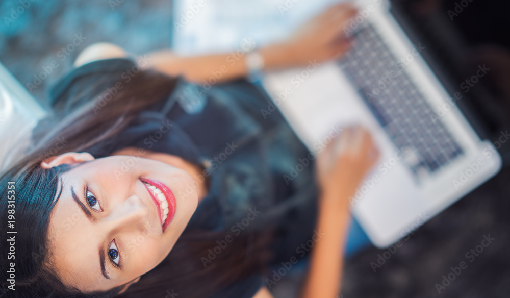 University student sit and do home work in computer notebook on the floor in bed room, this immage can use for internet, online,shopping, education and relax concept
