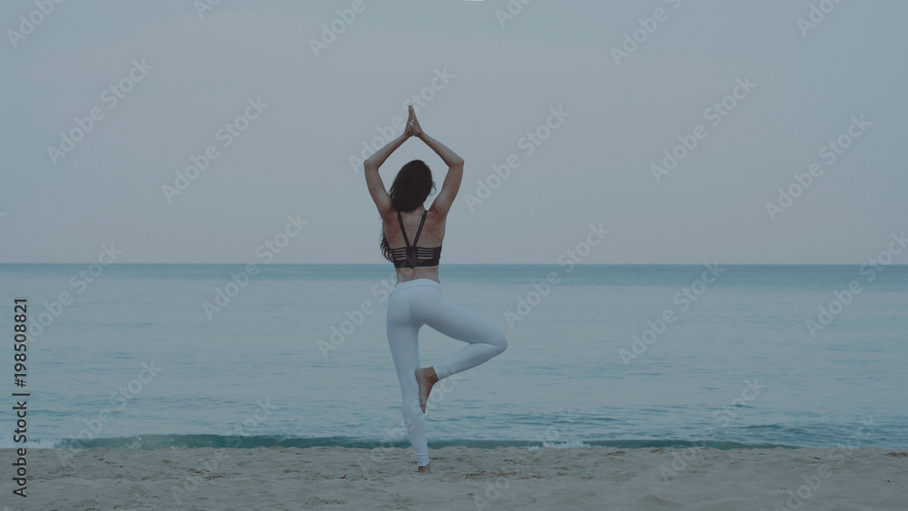 Back view of beautiful young girl exercising / doing yoga in the morning on the sandy beach over sea and sky background