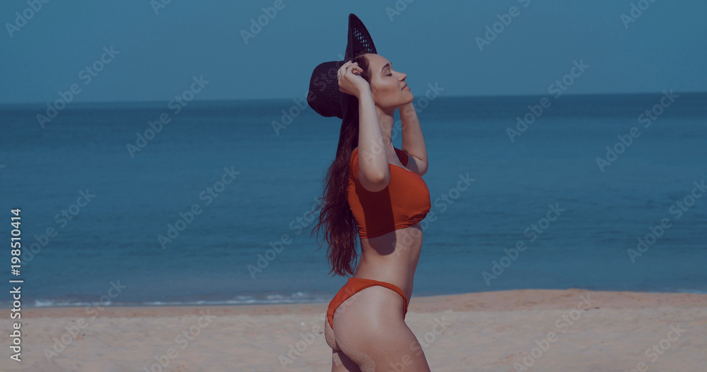 Beautiful girl in bikini and hat relaxing in the sun during summer holiday on the tropical sandy beach over sea and sky background