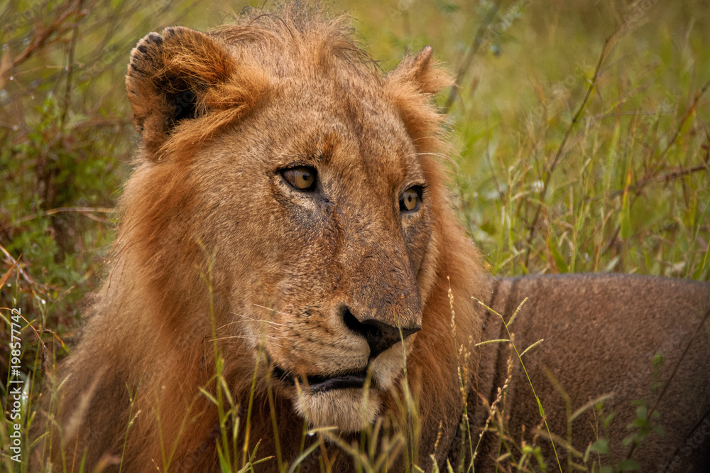 Male lion with a pensive look on his face
