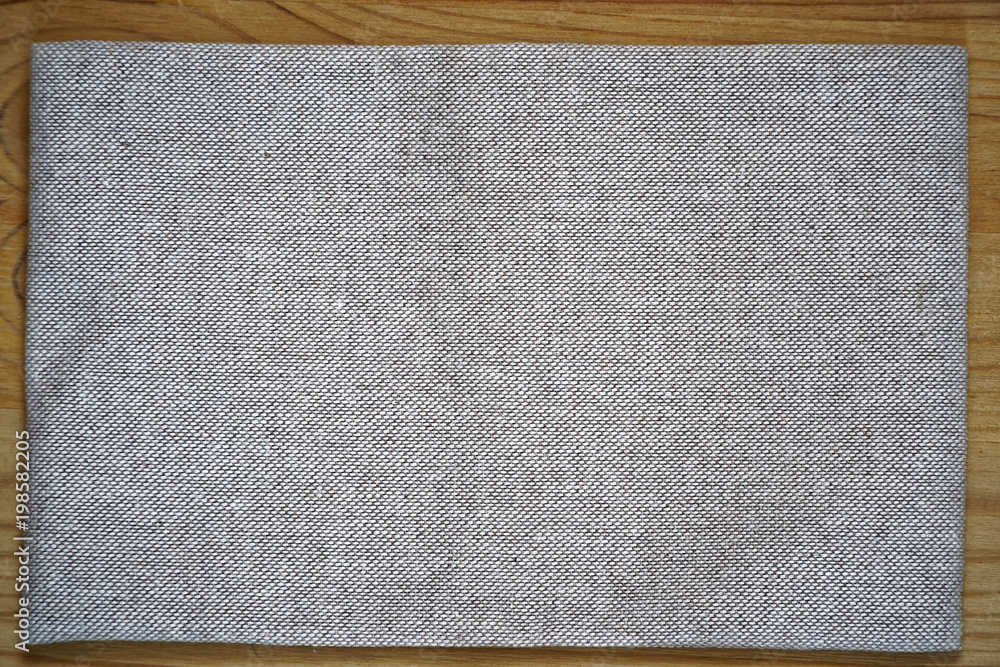 Linen fabric surface on wooden table for mock-up or designer use, book cover sample