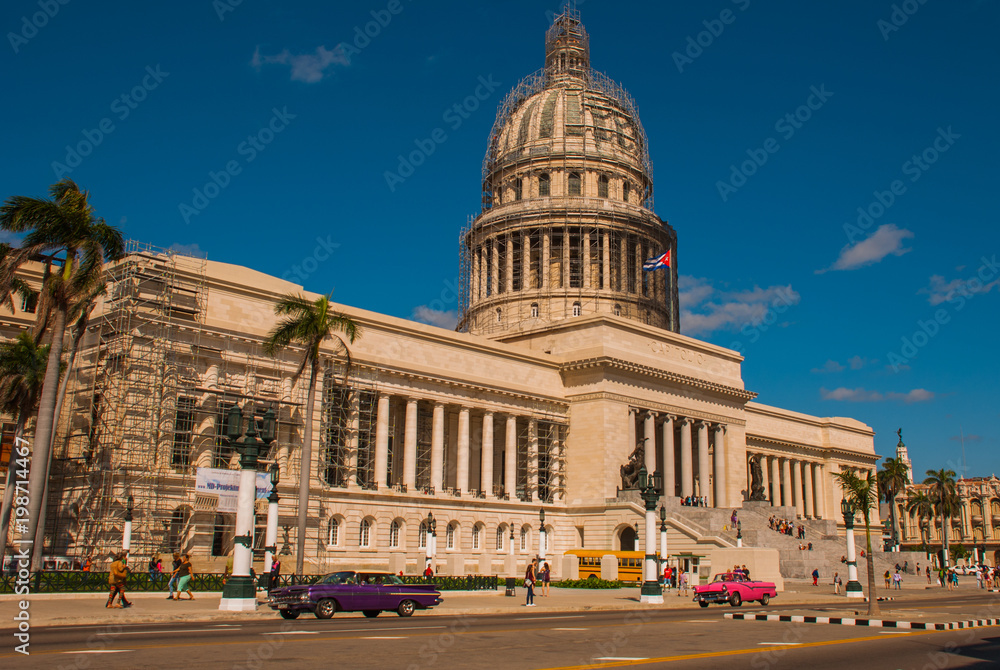 Capitolio Nacional, El Capitolio. Old classic retro cars and motorbikes are on the way. Havana. Cuba